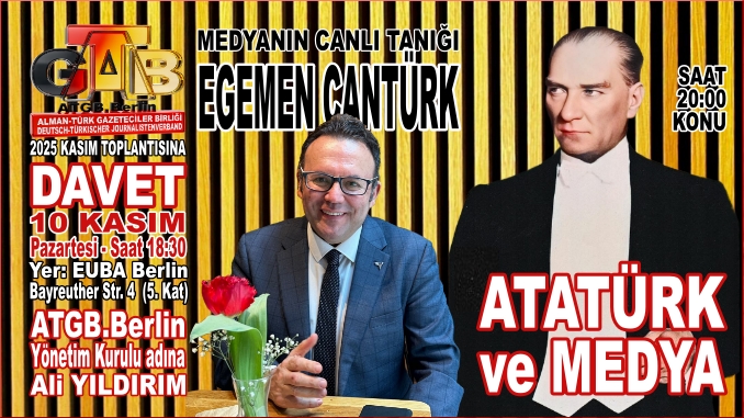 [ATGB.Berlin] Alman-Türk Gazeteciler Birliği KASIM AYI TOPLANTISINA DAVET Sizleri her ayın “İKİNCİ PAZARTESİ” günü (ATGB) Alman-Türk Gazeteciler Birliği tarafından gerçekleştirilen aylık olağan toplantımıza davet ediyoruz: 13.11.2023 Pazartesi günü, saat 18:30’dan itibaren TDU’da, Berlin, Ku’Damm 175 [...] -